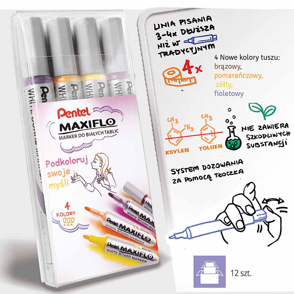Markery do tablic suchościeralnych Pentel MWL5M Maxiflo oferują imponującą długość linii pisania wynoszącą aż 1100 metrów. Dzięki nowoczesnej technologii systemu dozowania tuszu, markery te zapewniają 3-4 razy dłuższą linię pisania niż tradycyjne markery. Oznacza to, że możesz pisać dłużej bez konieczności częstej wymiany, co zwiększa efektywność i komfort pracy.