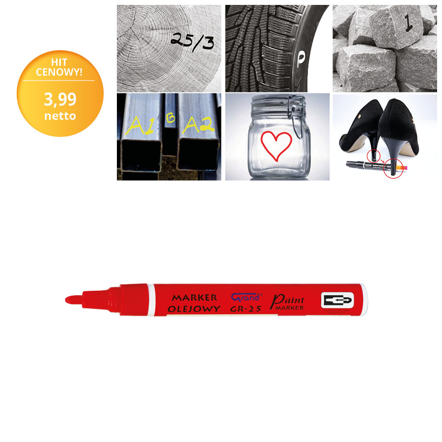 Marker olejowy GRAND GR-25, w kolorze czerwonym, to narzędzie, które zapewnia trwałe oznaczenia na każdej powierzchni. Dzięki wodoodpornemu i szybkoschnącemu tuszowi, Twoje oznaczenia będą wyraźne i odporne na działanie wody.