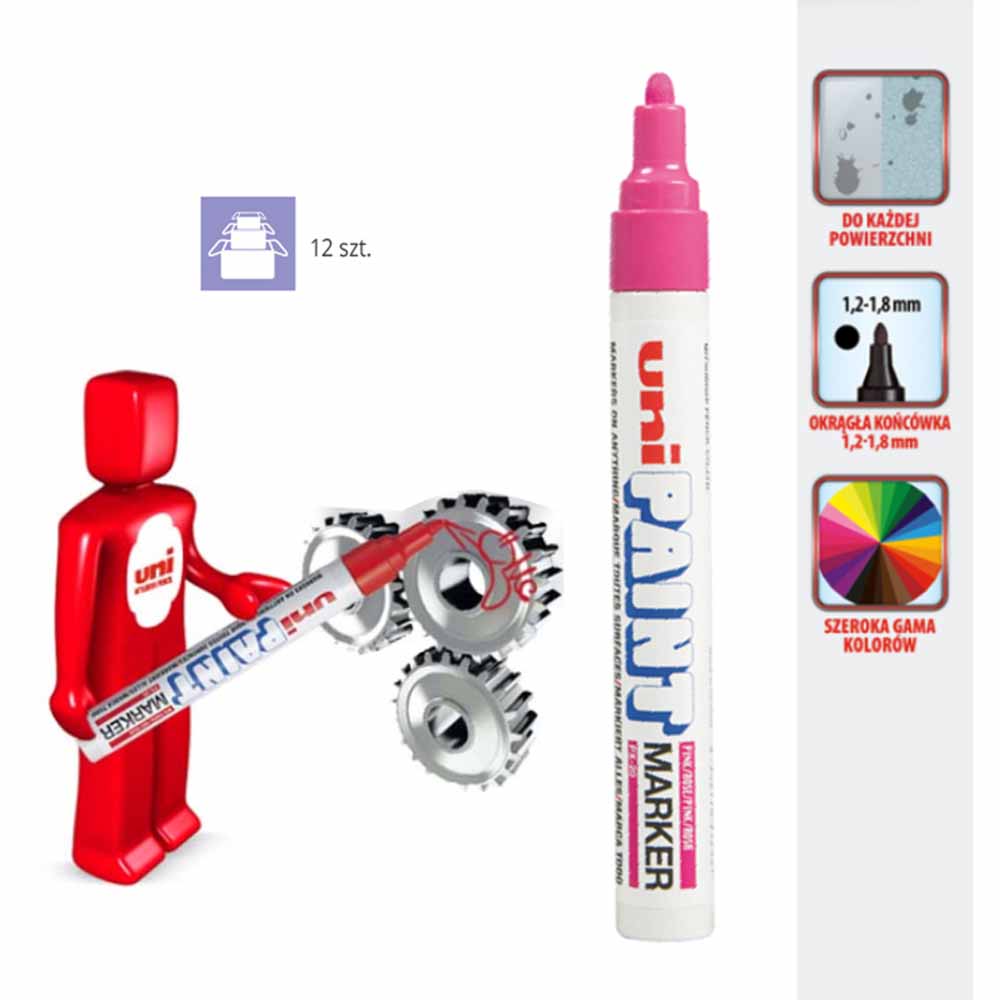Marker wyposażony jest w okrągłą fibrową końcówkę, która zapewnia równomierne i precyzyjne oznaczenia. Końcówka pompująca pozwala na płynne pisanie, eliminując przerwy w pracy i gwarantując komfort użytkowania.