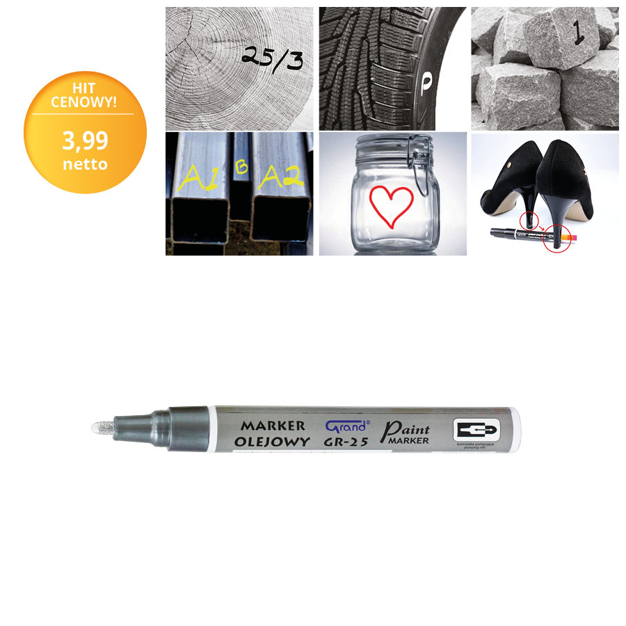 Marker olejowy GRAND GR-25, w kolorze srebrnym, to narzędzie, które zapewnia trwałe oznaczenia na każdej powierzchni. Dzięki wodoodpornemu i szybkoschnącemu tuszowi, Twoje oznaczenia będą wyraźne i odporne na działanie wody.