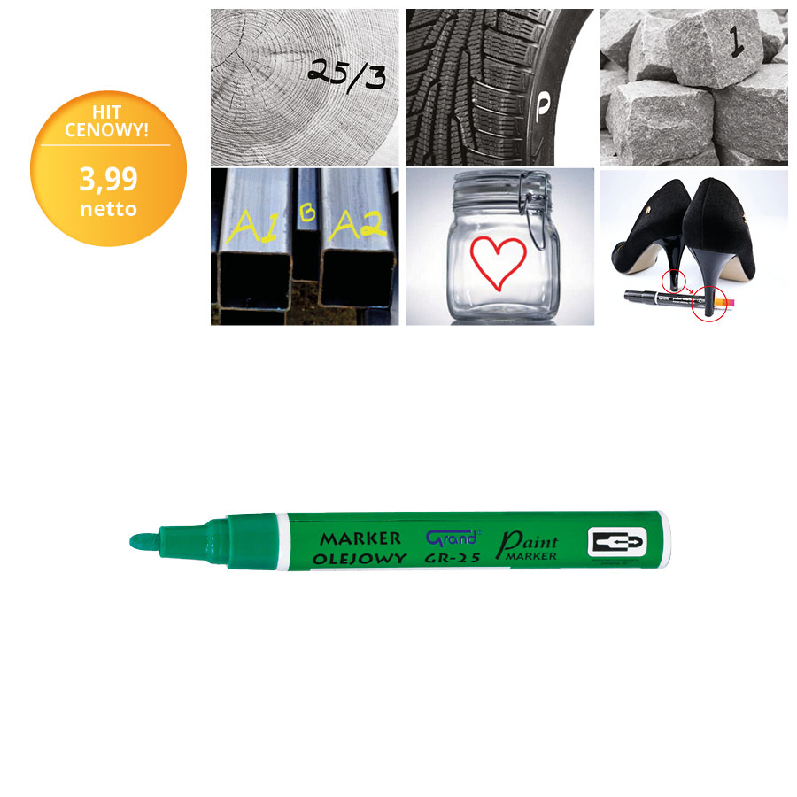 Marker olejowy GRAND GR-25, w kolorze zielonym, to narzędzie, które zapewnia trwałe oznaczenia na każdej powierzchni. Dzięki wodoodpornemu i szybkoschnącemu tuszowi, Twoje oznaczenia będą wyraźne i odporne na działanie wody.