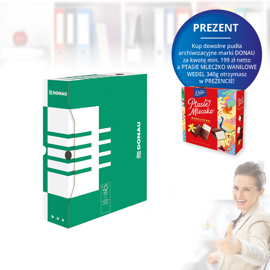 jm.: szt Kup dowolne pudła archiwizacyjne marki DONAU za kwotę min. 199 zł netto a PTASIE MLECZKO WANILOWE WEDEL 340g otrzymasz w PREZENCIE !