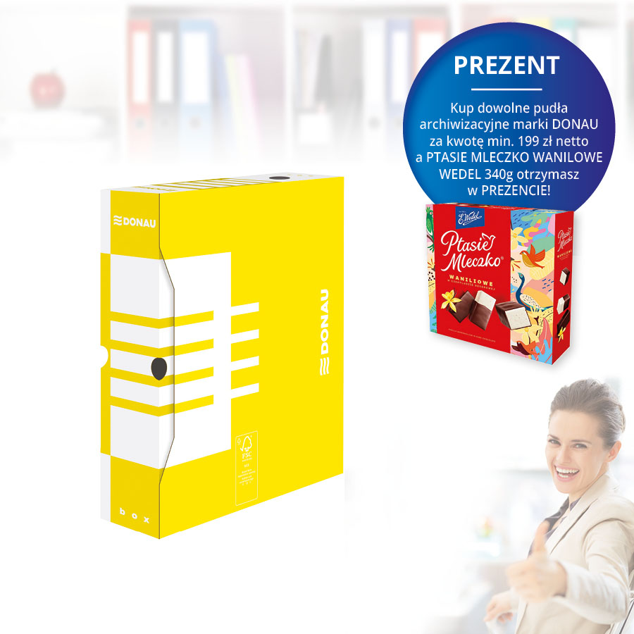 jm.: szt Kup dowolne pudła archiwizacyjne marki DONAU za kwotę min. 199 zł netto a PTASIE MLECZKO WANILOWE WEDEL 340g otrzymasz w PREZENCIE !