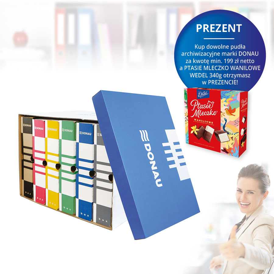 jm.: szt Kup dowolne pudła archiwizacyjne marki DONAU za kwotę min. 199 zł netto a PTASIE MLECZKO WANILOWE WEDEL 340g otrzymasz w PREZENCIE !