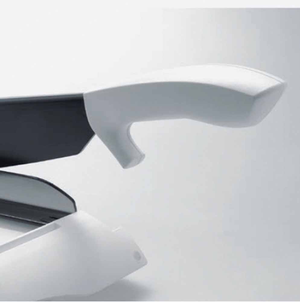 - wyposażona w specjalnie naostrzony, bezpieczny nóż, nie wymagający stosowania osłony (jej brak powoduje zmniejszenie gabarytów obcinarki tym samym min. łatwe przechowywanie)