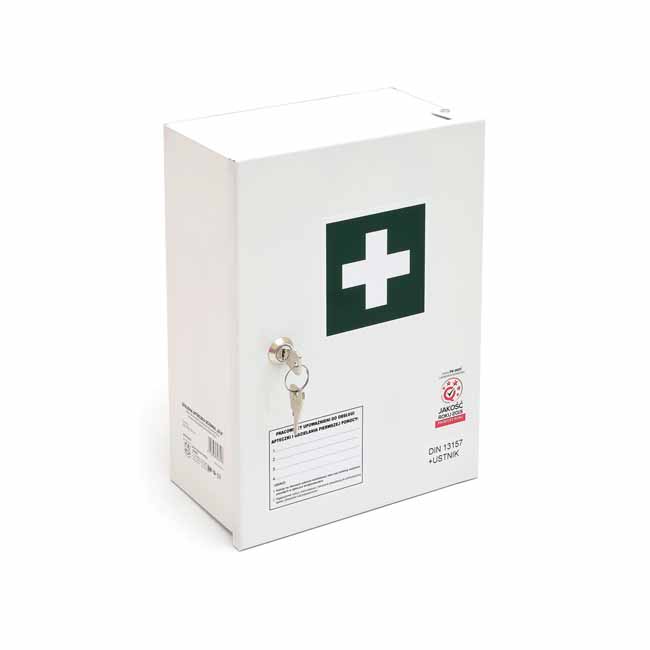naścienna apteczka przeznaczona do zakładów pracy szafka metalowa wykonana z blachy stalowej malowanej farbą proszkową zamykana na klucz uchwyty do zamocowania na ścianie wyroby medyczne oznakowane znakiem CE apteczka spełnia wymagania norm Unii Europejskiej termin ważności produktów sterylnych wynosi 5 lat wyposażenie: DIN 13164 + aparat do sztucznego oddychania zawiera: - plaster na szpulce 5m x 2,5cm – 1 szt. - zestaw plastrów - 14 szt. - bandaż elastyczny 4m x 6cm – 2 szt. - bandaż elastyczny 4m x 8cm – 3 szt. - rękawice winylowe - 4 szt. (2 pary) - chusta opatrunkowa 60cm x 80cm – 1 szt. - bandaż z kompresem (opatrunek indywidualny) 6cm x 8cm– 1 szt. - bandaż z kompresem (opatrunek indywidualny) 8cm x 10cm – 2 szt. - bandaż z kompresem (opatrunek indywidualny) 10cm x 12cm – 1 szt. - kompres na rany 10cm x 10cm – 6 szt./3 opak. - chusta trójkątna 96cm x 96cm x 136cm - 1szt. - koc termiczny (ratunkowy) – 1 szt. - nożyczki – 1 szt. - chusteczki nasączone – 2 szt. - maska medyczna – 2 szt. - instrukcja udzielania pierwszej pomocy – 1 szt. - aparat do sztucznego oddychania wymiary: 240 mm x 220 mm x 120 mm kolor: biały