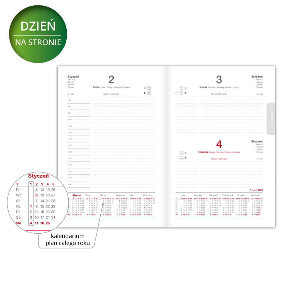 - brulionowe szycie i klejenie sprawia, że kalendarz wygodnie leży otwarty i nie zamyka się samoczynnie