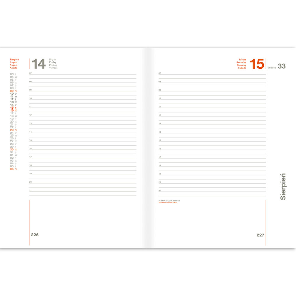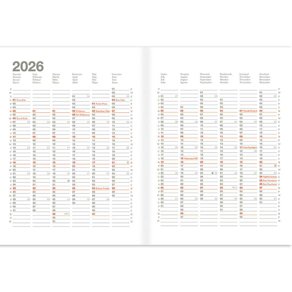 - szyto-klejony grzbiet gwarantuje wygodne otwieranie na płasko i długą żywotność kalendarza