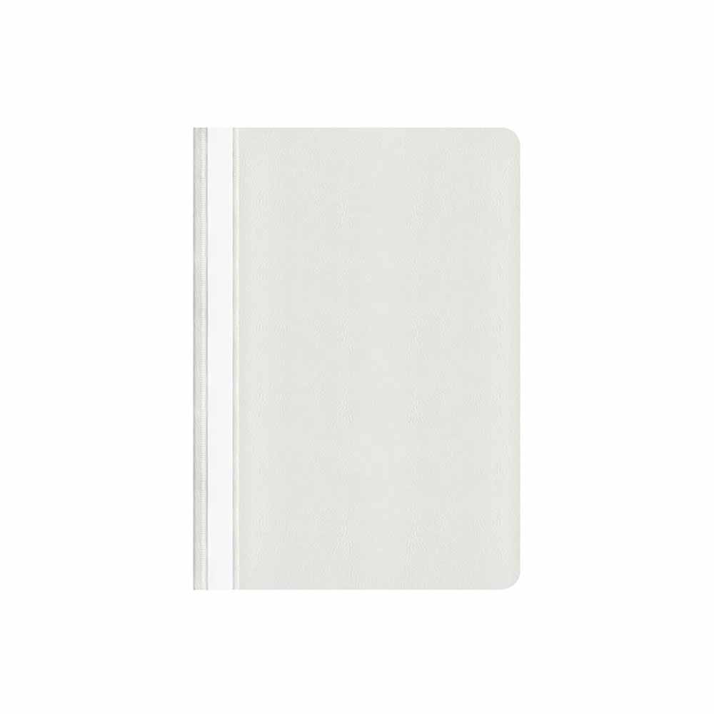 Skoroszyt wyposażony jest w wymienny, papierowy pasek do opisu, który ułatwia identyfikację zawartości. Dwa wycięcia umożliwiają szybkie i łatwe wysuwanie paska, co dodatkowo poprawia funkcjonalność. Zaokrąglone rogi obu okładek zwiększają komfort użytkowania i zapobiegają uszkodzeniom innych dokumentów.