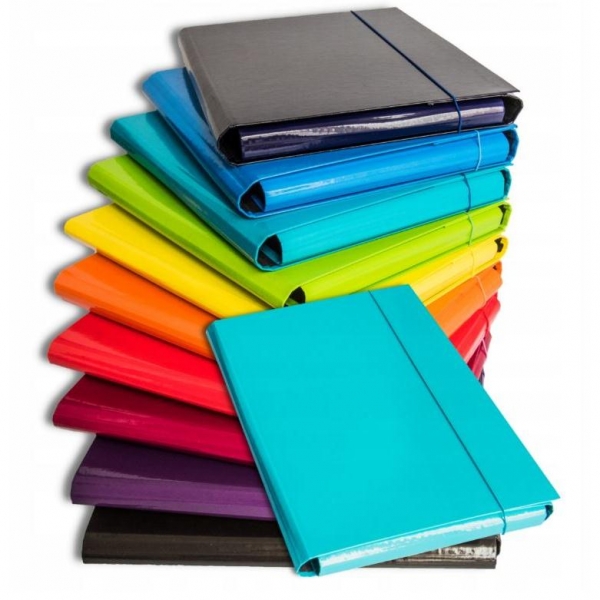 - zamykana za pomocą dwóch płaskich narożnych gumek w kolorze teczki